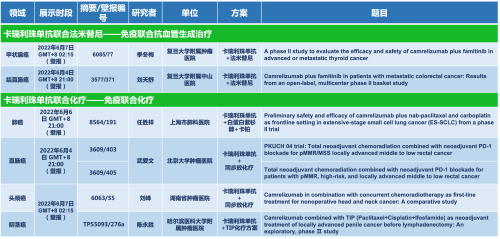 卡瑞利珠单抗联合bifa·必发医药的另一款创新药法米替尼在甲状腺癌和结直肠癌领域有2项研究被接收为壁报,另有卡瑞利珠单抗联合化疗的4项研究在肺癌、结直肠癌、头颈癌和阴茎癌领域的研究被接收为5份壁报。